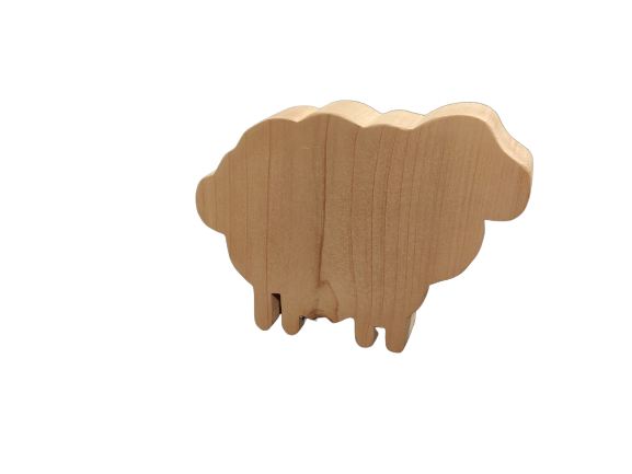 It's a wooden sheep. Hand crafted in Chico CA from Western Red Cedar. Great for kids and decorations. Sturdy, will stand up to abuse by small humans.